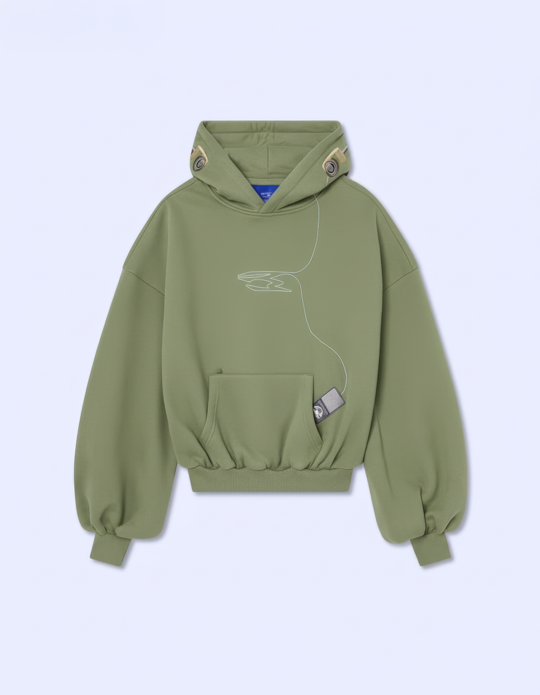 Made from 100% Cotton. Sage Green Heavyweight Fleece Fabric. Front Minimal Line-Art Graphic with Tonal Embroidery Effect. Oversized Metal Eyelet Hardware on Hood with Reinforced Canvas Tabs. Kangaroo Pocket with Side Utility Patch Featuring Circular Emblem Detail. Cropped Oversized Fit with Balloon Sleeves and Elasticated Hem. Ribbed Cuffs for Structured Silhouette. Large Back Graphic Patch Reading “MAIN CHARACTERS ONLY – GARMENT RATED BY NOEMOTIONS” with Distressed Effect. Blue Woven Inner Label with Signature Branding.