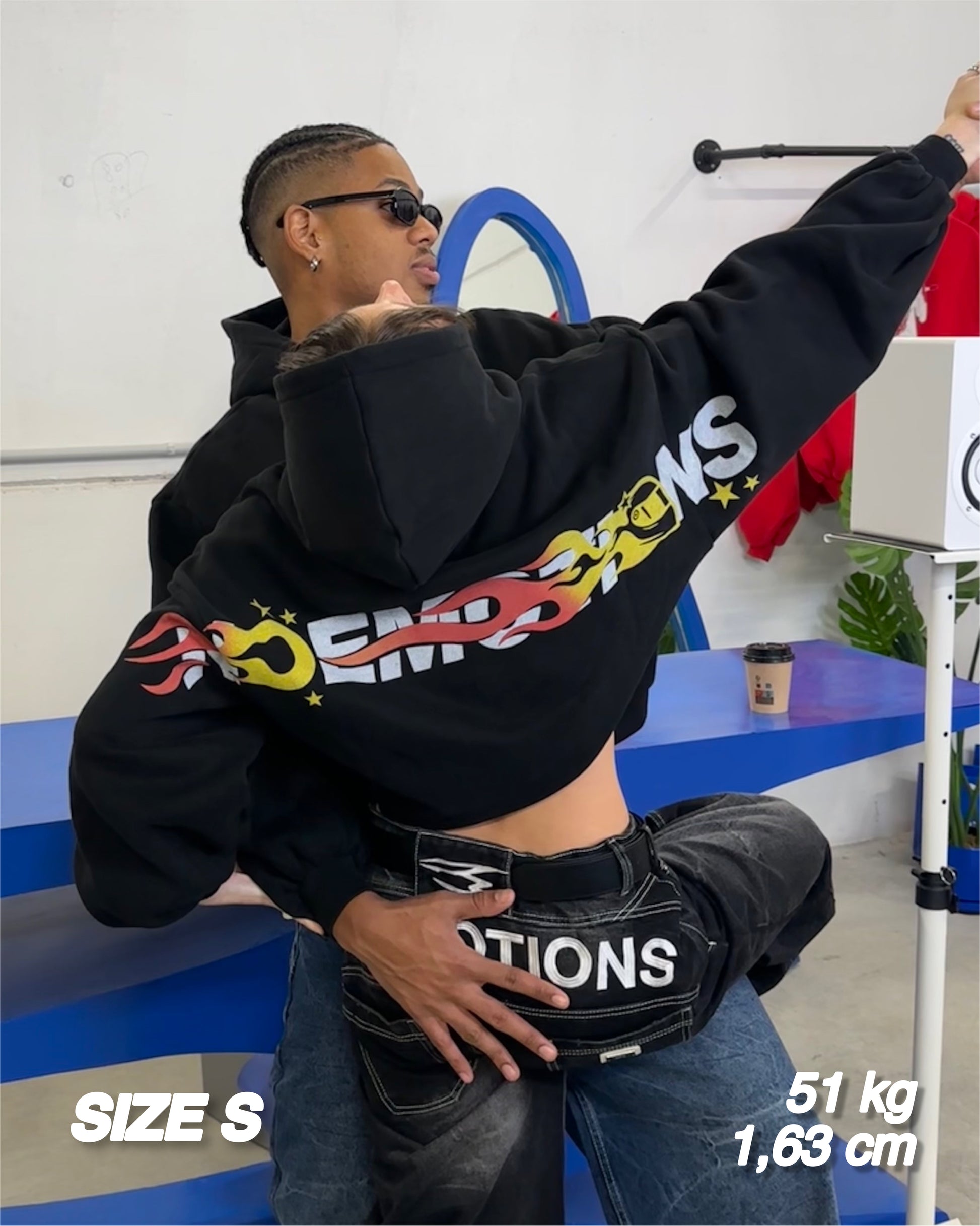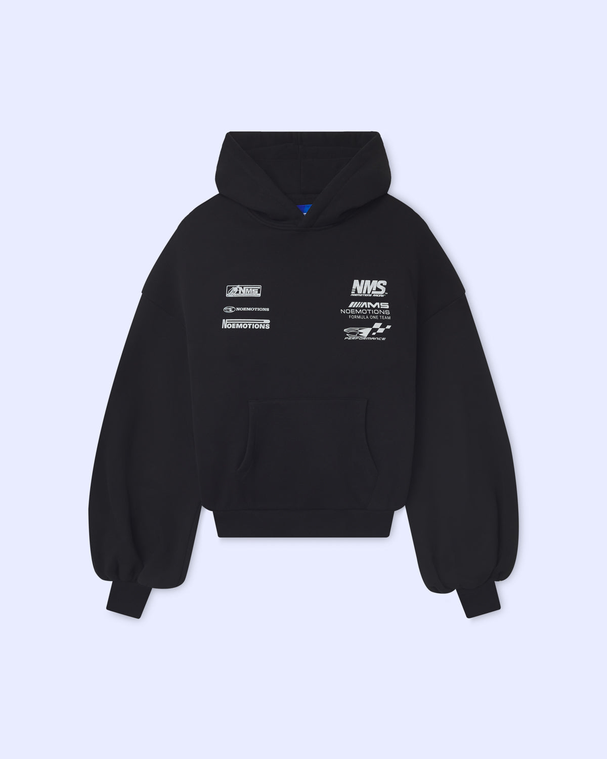 Made from 100% cotton heavyweight fleece for maximum comfort and structure. Features front branding embroidery and a bold multicolor “Noemotions” racing graphic across the back. Designed with dropped shoulders and an oversized cropped silhouette for a relaxed fit. Ribbed cuffs and hem ensure a snug finish, while the fully lined hood adds extra warmth. Blue woven inner label with signature branding.