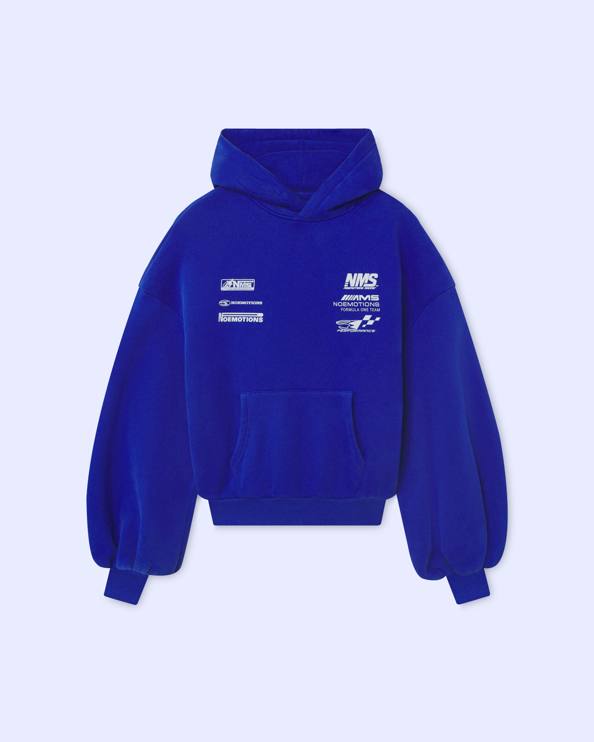 Made from 100% cotton heavyweight fleece for maximum comfort and structure. Features front branding embroidery and a bold multicolor “Noemotions” racing graphic across the back. Designed with dropped shoulders and an oversized cropped silhouette for a relaxed fit. Ribbed cuffs and hem ensure a snug finish, while the fully lined hood adds extra warmth. Blue woven inner label with signature branding.
