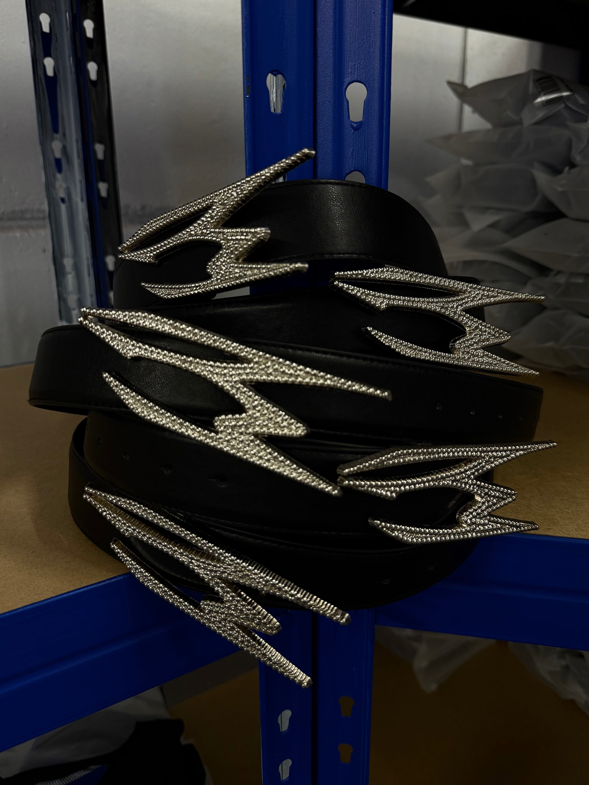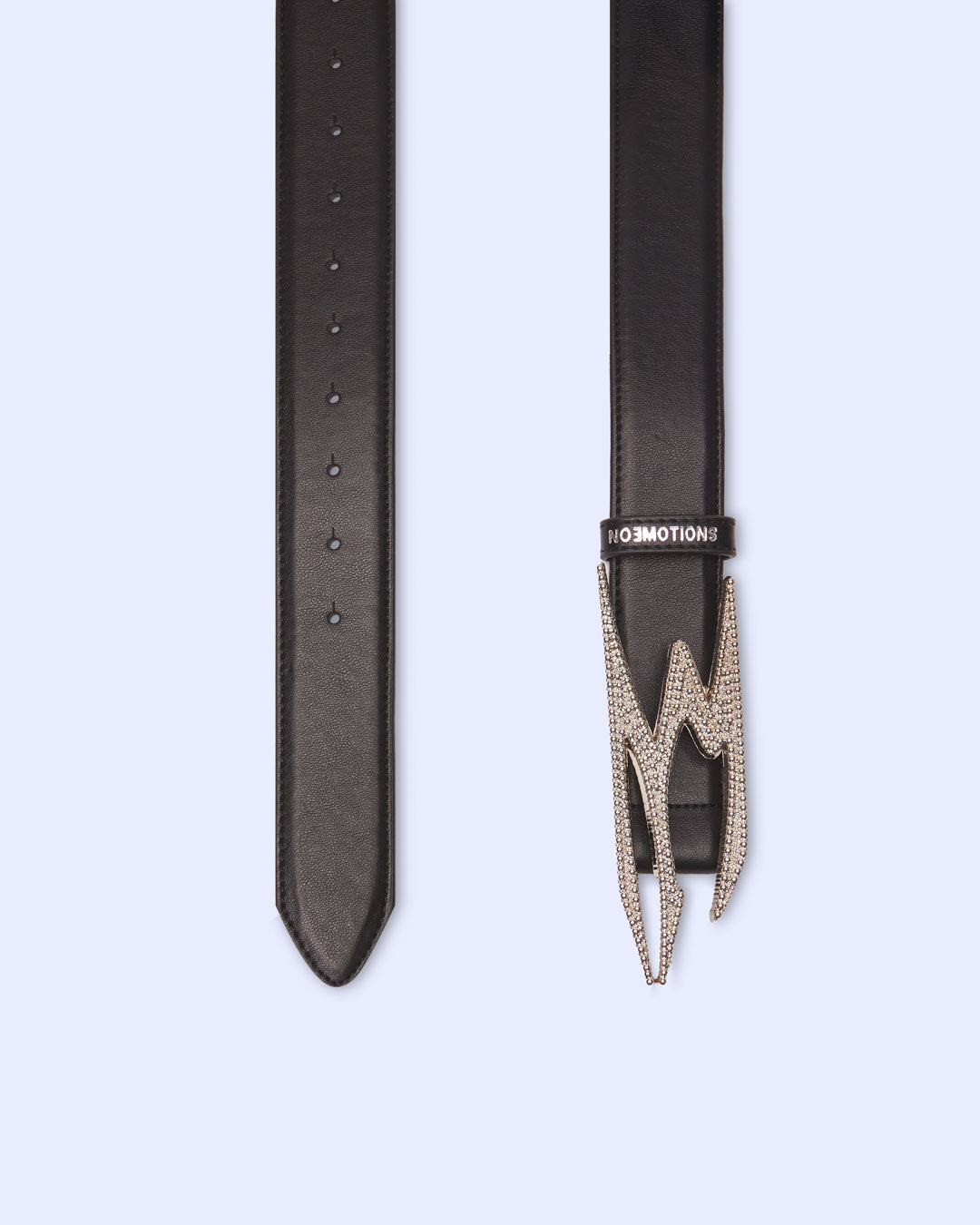 Made from Genuine Black Leather. Polished Finish with Tonal Stitching. Custom Lightning-Shaped Buckle in Silver Metal with Full Rhinestone Embellishment. Engraved NOEMOTIONS Logo on Loop Detail. Adjustable Fit with Multiple Belt Holes. Bold Sculptural Design with a Statement Silhouette. Premium Metal Hardware for Durability and Shine.